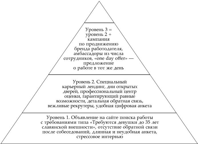Последовательность этих касаний называется картой пути сотрудника по аналогии с картой пути клиента[6], который взаимодействует с брендом или продуктом, проходя определенные стадии: изучение сайта, оформление и оплата заказа, посещение салона продаж или пункта выдачи, оформление возврата или взаимодействие со службой поддержки, ремонт и обслуживание, повторная покупка. На каждой из этих стадий клиент имеет определенные ожидания и испытывает эмоции. Точно так же и сотрудники переживают положительные или не очень чувства, сталкиваясь с корпоративными правилами, регламентами и процедурами на каждом из этапов своего пути. Опыт, который они приобретают в этом путешествии, называется опытом сотрудника. Первая часть книги посвящена тому, как сделать путь светлым, а опыт позитивным. В конце каждой главы будет приведена пирамида опыта: чем выше компания находится на этой пирамиде, тем более запоминающийся и благоприятный опыт она обеспечивает своим людям. Главный рецепт успеха – это относиться к сотруднику как к клиенту, стараясь предугадать и превзойти его ожидания.