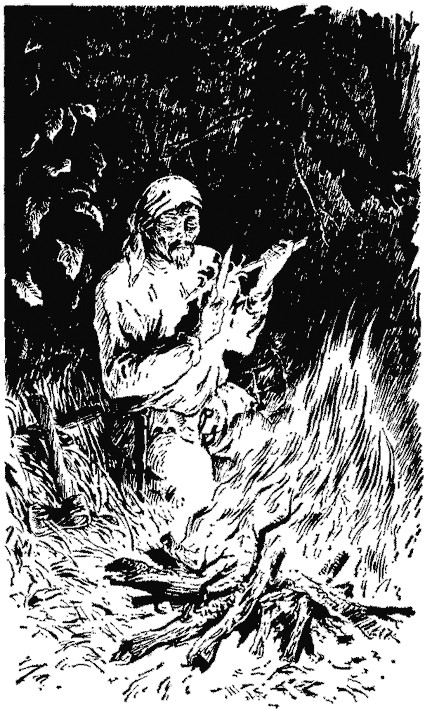Поздно вечером я снова выглянул в окно. Ветер раздувал потухший костёр. На минуту вспыхивало тусклое пламя и на мгновение освещало худую фигуру старика.
