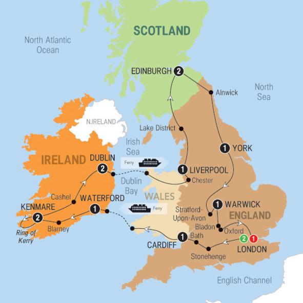 Лучший из найденных маршрутов назывался незатейливо «Wonders of Britain and Ireland» («Чудеса Британии и Ирландии»), занимал 12 дней и одна из устраивавших нас дат отъезда из Лондона приходилось на 24-е апреля, а цифру 24 я почему-то люблю с детства. Чисто же географически выглядел он следующим образом: