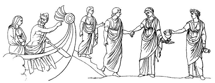 Пируют боги. Дочь Зевса, юная Геба, и сын царя Трои, Ганимед, любимец Зевса, получивший от него бессмертие, подносят им амврозию и нектар — пищу и напиток богов. Прекрасные хариты [10] и музы услаждают их пением и танцами. Взявшись за руки, водят они хороводы, а боги любуются их легкими движениями и дивной, вечно юной красотой. Веселее становится пир олимпийцев. На этих пирах решают боги все дела, на них определяют они судьбу мира и людей.