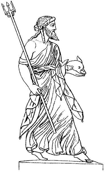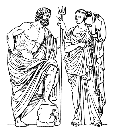 Глубоко в пучине моря стоит чудесный дворец великого брата громовержца Зевса, колебателя земли Посейдона. Властвует над морями Посейдон, и волны моря послушны малейшему движению его руки, вооруженной грозным трезубцем. Там, в глубине моря, живет с Посейдоном и его прекрасная супруга Амфитрита, дочь морского вещего старца Нерея, которую похитил великий властитель морской глубины Посейдон у ее отца. Он увидал однажды, как водила она хоровод со своими сестрами-нереидами на берегу острова Наксос. Пленился бог моря прекрасной Амфитритой и хотел увезти ее на своей колеснице. Но Амфитрита укрылась у титана Атласа, который держит на своих могучих плечах небесный свод. Долго не мог Посейдон найти прекрасную дочь Нерея. Наконец открыл ему ее убежище дельфин; за эту услугу Посейдон поместил дельфина в число небесных созвездий. Посейдон похитил у Атласа прекрасную дочь Нерея и женился на ней.