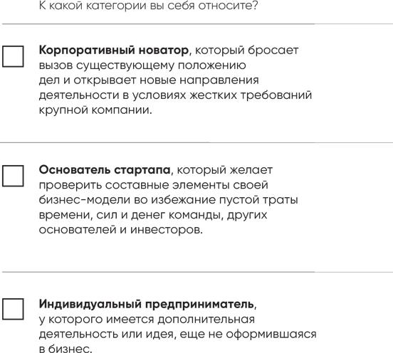 Эта книга адресована корпоративным новаторам, основателям стартапов и индивидуальным предпринимателям.