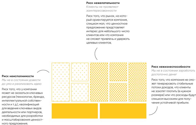 Риск заключается в том, что у компании может не оказаться ключевых ресурсов (технологии, бренда, интеллектуальной собственности и т.д.), квалификаций для ведения ключевых видов деятельности или партнеров, необходимых для разработки и масштабирования ценностного предложения.