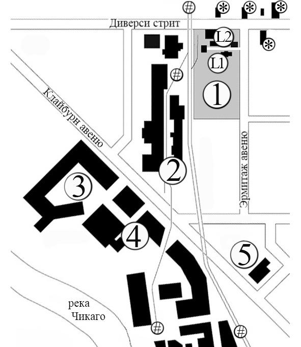 Жилой дом семьи Лютгерт и принадлежавшая главе семейства колбасная фабрика занимали целый квартал в промышленном районе к северу от реки Чикаго. Строго говоря, локацию эту правильнее было бы назвать фабрично-кабацкой, поскольку вокруг находились не только промышленные предприятия, но и питейные заведения. Западнее территории, принадлежавшей Лютгерту, в соседнем квартале, находились мрачные корпуса крупного металлургического завода компании «M. Lassing bridge & iron works» [число занятых превышало 1,5 тысячи человек]. Кварталы эти разделялись глухими заборами и двумя рядами железнодорожных путей, эксплуатировавшихся компанией «Сhicago & North Western railway». Юго-западнее колбасной фабрики находился крупный машиностроительный завод фирмы «William Deering & Co. agricultural works», выпускавший разнообразную технику для сельского хозяйства [число работников этого предприятия весной 1897 года превышало 1,2 тысячи человек]. Наконец, южнее фабрики Лютгерта располагались ещё 2 довольно крупных завода, хотя и поменьше поименованных выше. Один из них — фирмы «Twin works» — занимался различными подрядными работами, связанными с механической обработкой металлоконструкций, а другой, принадлежавший компании «Northwestern terra cotta works», специализировался на выпуске всевозможных фаянсовых изделий [изоляции электропроводки, санитарно-гигиеническом оборудовании и прочем]. Наконец, 2 квартала восточнее участка Лютгерта были заняты жилой застройкой. К северу от колбасной фабрики также располагались жилые кварталы.