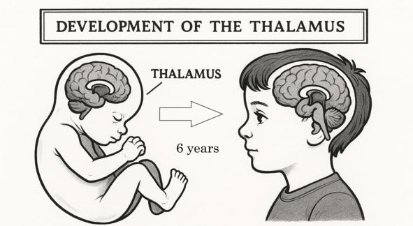 Формирование таламуса начинается в эмбриогенезе, но его функциональная зрелость достигается только в раннем детстве. Критически важный период развития и «настройки» таламической фильтрации — это возраст от рождения до 6 лет в среднем. Именно в это время таламус обучается различать важные и второстепенные стимулы, синхронизировать ритмы восприятия и формировать базу для обучения, взаимодействия и управления.