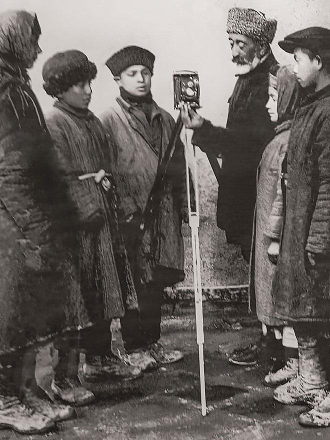 Примерно в то же время первым режиссером региона стал Худойберген Девонов4, учившийся фото- и видеосъемке у немца Вильгельма Пеннера, проживавшего в поселении Коппенталь неподалеку от Хивы5. В 1908 году Девонов отправился в Петербург, где закупил аппаратуру для будущей кинолаборатории и в том же году сделал свои первые кадры, на которых была представлена архитектура Хивы и коллективный портрет местных жителей. Эти кадры практически ничем не отличаются от хроники тех же лет, снятой в Европе или России. В целом это неудивительно: зарубежные картины, как мы знаем, уже прокатывались в Туркестанском крае, и, скорее всего, Худойберген был с ними знаком. Однако они ценны в первую очередь тем, что через них мы, по сути, можем взглянуть на начало XX века в Российской империи глазами режиссера-мусульманина, — согласитесь, не самый распространенный опыт.