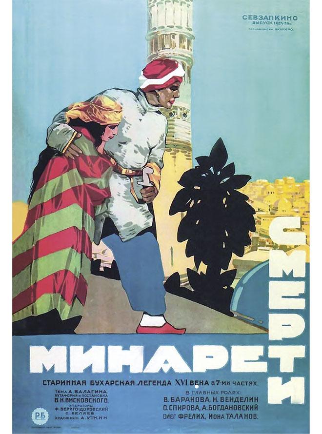 Тем не менее в 1920-е годы киностудии, хотя и создавались государством, должны были самоокупаться, а потому исключительно идеологические картины порой чередовались со зрительскими, не нагруженными лозунгами и призывами. Ярчайший пример такой ленты — фильм «Минарет смерти» (1925) Вячеслава Висковского, снятый ленинградским «Севзапкино» (будущим «Ленфильмом») совместно с «Бухкино» по мотивам бухарской легенды XVI века. В этом истерне дочь хивинского хана Джемаль и ее молочная сестра Селеха несколько раз оказываются в руках то разбойников, то местной знати, пока главную героиню не спасает ее возлюбленный. Сюжет фильма, как нетрудно заметить, ни в одном элементе не отсылает к настоящему, а концентрируется на воображаемом прошлом — эдакой «восточной сказке», поставленной тем не менее без участия местных жителей. Таким же образом были сняты еще несколько картин тех лет — к примеру, «Глаза Андозии» («Пролеткино», 1926) и некоторые другие фильмы российского кинематографиста Дмитрия Бассалыго.