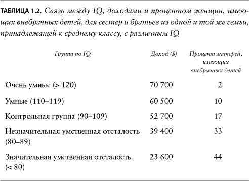 Мюррей выяснил, что даже в такой стабильной, преимущественно представленной средним классом, группе испытуемых различия в IQ приводят к значительному разбросу результатов. В таблице 1.2 показано, что если у человека есть брат или сестра с нормальным уровнем IQ, но в то же время он сам отличается очень высокими умственными способностями, то его доход по сравнению с «нормальным» ребенком из той же семьи оказывается выше более чем на треть (и, следовательно, обычно он имеет более престижную работу). Если в семье один из детей имеет нормальный IQ, а другой — значительно ниже нормы, доход последнего составляет менее половины от дохода первого. У женщин с IQ значительно ниже нормы (< 80) в два с половиной раза чаще рождаются дети вне брака, чем у их сестер со стандартным IQ.