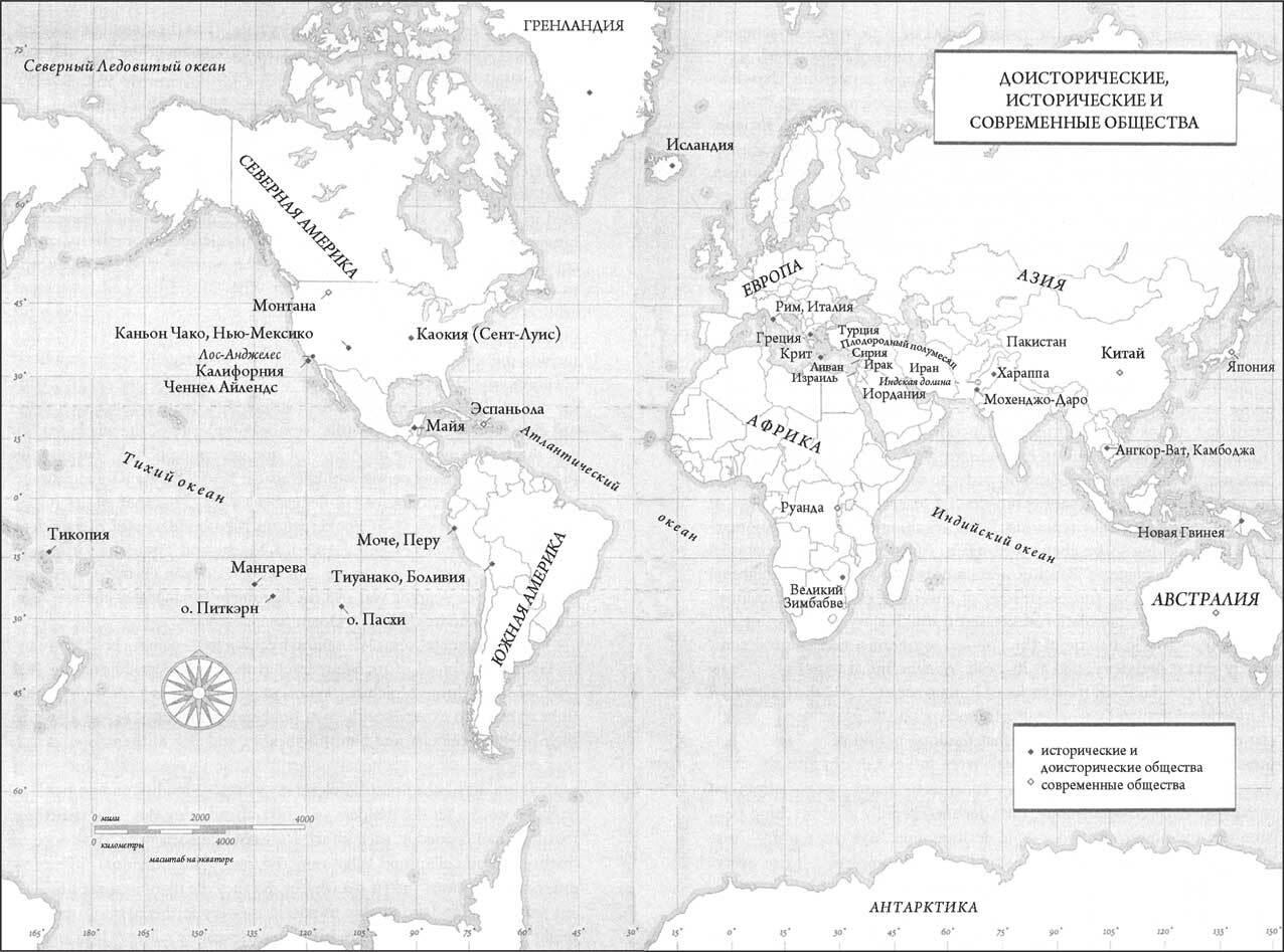 Норвежская Гренландия – всего лишь один из многих примеров, когда общество коллапсировало или погибло, оставив после себя монументальные руины, как в стихотворении Шелли «Озимандия». Под коллапсом я подразумеваю резкое падение численности населения и/или потерю политических, экономических, социальных достижений на значительной территории на продолжительное время. Явление коллапса, таким образом, считается крайней формой длительного процесса упадка, и нужно задаться вопросом, насколько резким должен быть упадок в обществе, чтобы его можно было считать коллапсом. Порой постепенные процессы упадка включают в себя мелкие случайные взлеты и падения и мелкие политические\ экономические\ социальные перестройки, неизбежные для каждого общества. Какое-то государство завоевывается соседом, либо его упадок связан с усилением соседа, при этом состав населения и культура в регионе не меняются. Происходит замена одной правящей элиты на другую. В свете этого чаще всего в качестве коллапсов рассматривают скорее известные примеры, чем мелкие: индейцы анасази и каокийцы в пределах США, города майя в Центральной Америке, цивилизации моче и Тиуанако в Южной Америке, микенская цивилизация в Греции и минойская на Крите в Европе, Великий Зимбабве в Африке, Ангкор-Ват и хараппские города долины Инда в Азии и остров Пасхи в Тихом океане (карта 1).