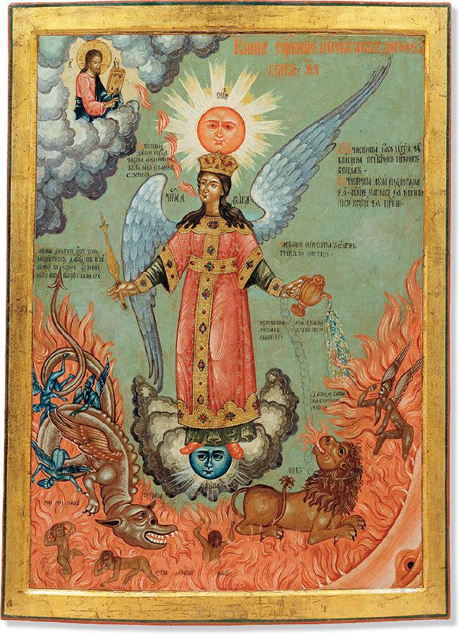 «Душа чистая» в облике крылатой девушки, стоящей на облаке. В ее короне – солнце, а под ногами – луна. Она попирает грехи и страсти. Справа под ногами Души – дракон (змей), а слева – лев, «лютый враг», связанный ее «чистотой». Оба зверя символизируют дьявола (лев, кроме того, – ярость и злобу). Вокруг вьются хохлатые и крылатые бесы. Из сосуда дева льет слезы, которые тушат пламя геенны. Эти аллегорические изображения встречались в разных вариациях с XVII в. (в 1627 г. гравюру с таким сюжетом издали в Киево-Печерском монастыре). Крылатая девушка или монах, распятый на кресте, побеждали страсти постом, смирением и другими добродетелями.