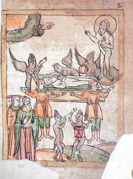 Змей мытарств. Демоны преследуют ангелов, те уносят от них души умерших (маленькие белые фигурки). Некоторые души пытаются убежать, карабкаясь по извивающемуся телу змея, но бесы хватают их за ноги и за руки. Справа внизу – души, не прошедшие испытаний. Демоны ведут их в преисподнюю, а ангел сверху бьет грешников копьем.