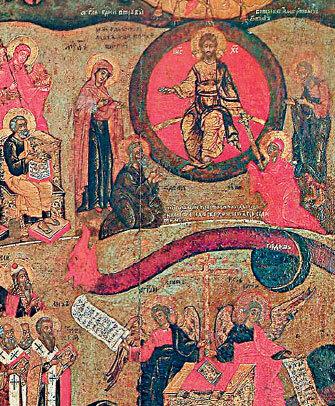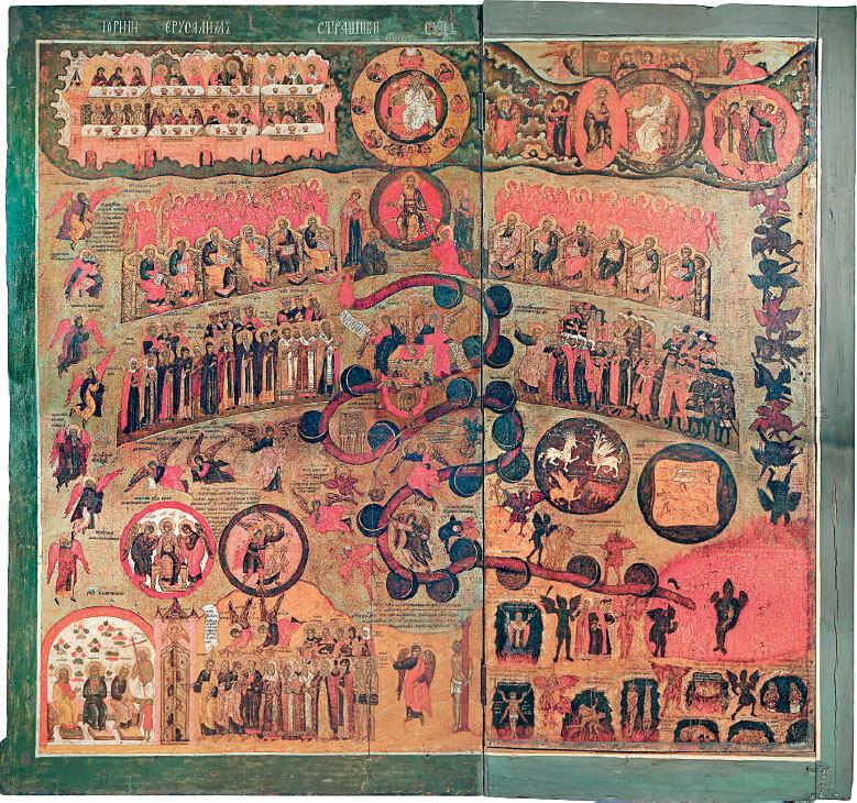Страшный суд: слева от Христа, в правой части иконы, в струях огня падшие ангелы низвергаются с небес, превращаясь в бесов. В раскрытой пасти Ада сидит дьявол с Иудой на руках. У демонов голые тела, крылья и вздыбленные прически – обо всем этом мы поговорим в третьей главе. Но самый верхний бес выглядит как толстая белая птица. Правда, вместо хвоста у нее растет нога с человеческой ступней и вывернутым назад коленом.