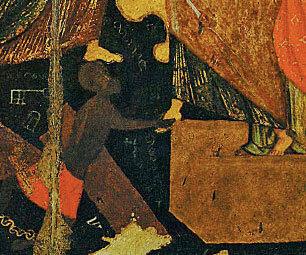 Христос освобождает праведников, которые томились в преисподней из-за первородного греха Адама и Евы. Он берет Адама за руку, поднимая другой рукой крест, символ спасительной жертвы. Внизу дьявол – бородатая фигура в красной набедренной повязке – тщетно пытается задержать своего бывшего узника. Он хватает Адама «за пяту» – так же, как змей на изображениях Страшного суда.