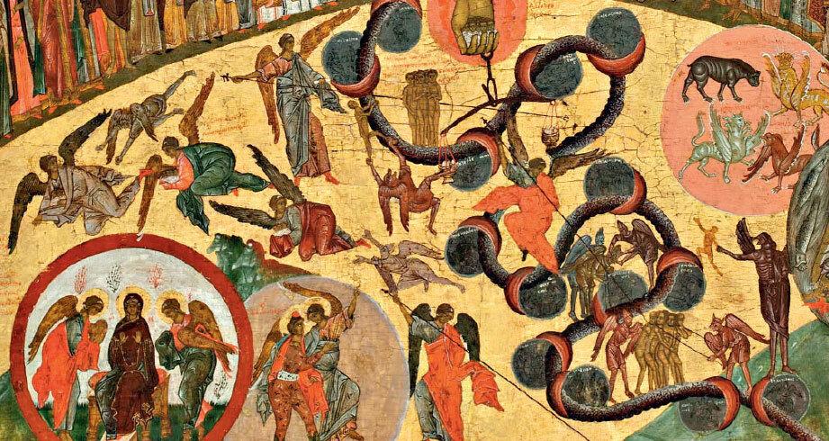 Справа (от зрителя) демоны низвергаются с небес в преисподнюю. Внизу осужденные грешники мучаются в разных сегментах ада. А в середине извивается змей, унизанный кольцами. Так на Руси с середины XV в. стали изображать посмертные испытания. Каждое кольцо – бесовская станция, где душу пытаются обвинить в одном из грехов. Рядом вьются демоны, а ангелы стараются унести от них души усопших. Почему мытарства расположили на теле змея, а не на лестнице или облаках (как бывало на миниатюрах) становится ясно, если приглядеться к деталям. Змей выходит из пасти ада, а вверху пытается ухватить Адама за пяту. Это отсылка к змею-искусителю, из-за которого случилось грехопадение и люди были изгнаны из рая. На некоторых иконах об этом писали напрямую («змей, искусивший Адама…»). Одновременно такая поза змея намекает на «пяту» (то есть конец) жизни человека, когда начинаются посмертные испытания.