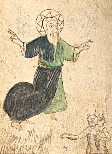 В апокрифической «Беседе трех святителей» дьявол назван первым жителем земли (первым, кто «наречеся на земли»), а его падение приурочено ко времени за четыре дня до создания Адама – то есть к третьему дню творения (отсчет включает шестой день, когда были созданы люди)[18]. Эту редкую версию проиллюстрировали в синодике XVIII в. – на третьей миниатюре нарисована трава и два рогатых демона[19].