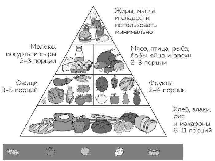 За основу рациона рекомендовали выбирать зерновые, а также фрукты и овощи, за которыми следовали белковые и молочные продукты. А на самой вершине – не как главный элемент питания, а как вишенка на торте – масла, жиры и сладости в очень скромных количествах.