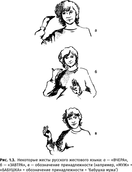 Жестовые языки глухих обладают всеми свойствами, присущими звуковым языкам, кроме канала передачи информации28. Вопреки распространенному заблуждению, жесты этих языков передают не отдельные буквы (хотя пальцевая азбука — дактилология — тоже имеется, прежде всего для передачи имен собственных), а целые слова (или морфемы). Каждый жест-слово состоит из незначимых элементов — хирем, а из слов, как и в звуковом языке, составляются словосочетания и предложения.