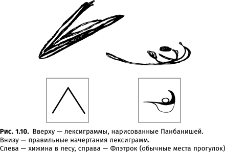 А недавно выяснилось, что обезьяны в принципе способны даже овладеть письмом: однажды Панбаниша (одна из сестер Канзи), в одиночестве тоскуя у окна и желая отправиться на прогулку, в конце концов взяла в руки мел и нарисовала на полу соответствующие лексиграммы (наиболее узнаваем уголок — символ, обозначающий хижину в лесу)51.