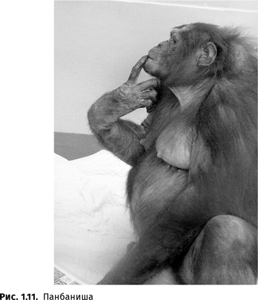 Но значит ли это, что обезьяны овладели человеческим языком? Очевидно, нет. Один из участников эксперимента с Уошо — глухой, для которого амслен был родным языком, — отмечал, что слышащие люди «все время видели больше жестов, чем я… Может быть, я что-то пропустил, но я так не думаю. Я просто не видел никаких жестов»52. Почему же так произошло? Ведь жесты Уошо тоже выдерживали проверку двойным слепым контролем. Можно предположить, что причин этому две. Первая состоит в том, что «по оценкам специалистов, жестовая речь обезьян соответствовала скорее „лепету“ двухлетних глухонемых детей, чем языку взрослых»53. Поэтому понять их жесты постороннему человеку, вероятно, так же трудно, как догадаться, что, например, произнесенное незнакомым малышом пихо означает ‘подземный переход’. Вторая причина — в том, что Уошо не соблюдала грамматику амслена (отчасти потому, что ее этому просто не учили).