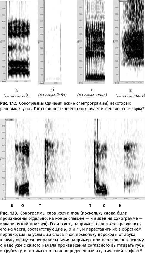 Непросто устроены и сами звуки. Наш речевой тракт — природный резонатор. Изменяя его форму при помощи движений языка, губ, нижней челюсти, нёбной занавески, надгортанника, мы ослабляем одни частоты и усиливаем другие. У гласных такие области усиления частот получили название «форманты». Каждый гласный характеризуется собственным «узором» формант. Согласные тоже имеют свои частотные максимумы и минимумы, но распознаются в значительной степени по тому влиянию, которое они оказывают на форманты соседствующих с ними гласных. Например, после заднеязычного согласного (г или к) у последующего гласного сближаются начальные точки контуров второй и третьей формант. Если звуки в слоге поменять местами, человек услышит не слог, произнесенный наоборот, а бессмысленную абракадабру, поскольку привычные ему правила перехода от звука к звуку не будут соблюдены.