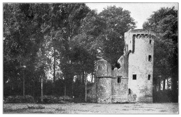 From there we were off once more to visit the ruins of the old château of Havré, once the stronghold and residence of the de Croÿ family. It rose high out of a stagnant moat, all gray and pinkish, with irregular architecture and a tall tower with a bulbous top. From this rose the cross of Lorraine, for the de Croÿs quartered their arms with this great family. The château was quite stately and magnificent, and its courtyard, all grass-grown, must have seen fine sights in its day.