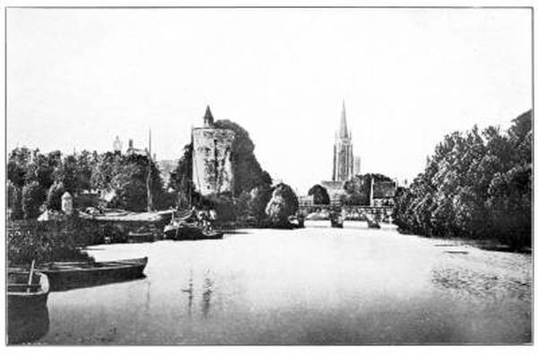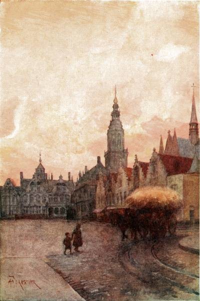 Mons was a dull, quiet old town, rather picturesque in its way, with its old church and belfry crowning the hill. As we came out of the church the chime of bells in the tower musically rang the hour, sounding sweetly in the sleepy silence of the place. The stillness has since been broken by other sounds than those, for Mons figured largely in the battle of the Meuse.