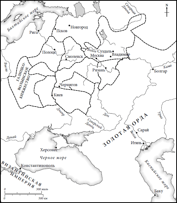 Слова «Россия» и «русские» применительно к Средним векам не вполне уместны. Я пользуюсь словом «Русь» для обозначения восточнославянских народов этого периода и княжеств, располагавшихся в то время в современной европейской части России и на части современной Украины. Иван IV во время коронации в 1547 году принял титул «царя всея Руси»; после этой даты я начинаю называть Московское княжество Россией, а его население – русскими.