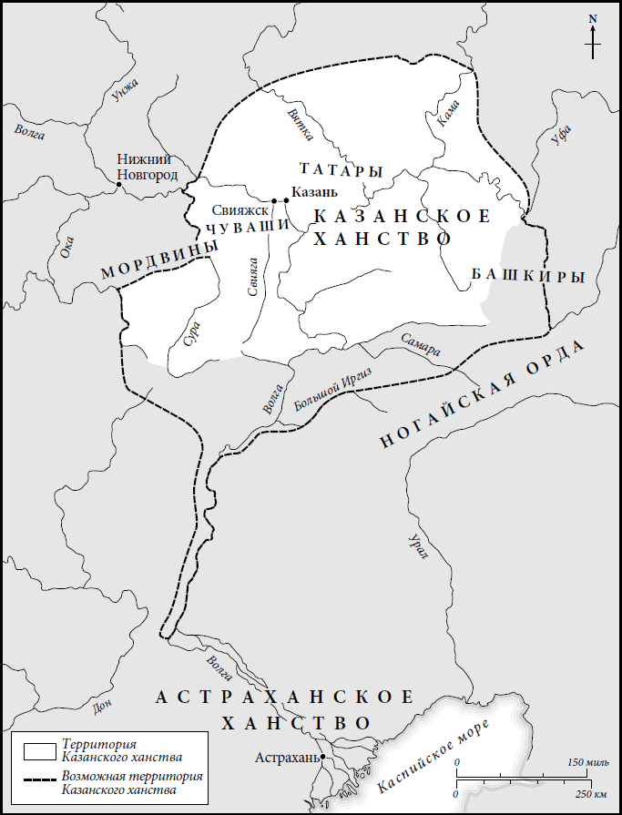 Казань была основана как пограничный пункт в Волжской Булгарии. Археологические раскопки свидетельствуют, что город появился, вероятнее всего, в самом начале XI века. Восхождение Казани было связано с упадком Золотой Орды, но важным было и благоприятное расположение города на слиянии Казанки и Волги, недалеко от впадения в Волгу Камы. В начале XV века Казань, судя по всему, стала столицей ханства и затмила Болгар; иногда ее даже называли «Новым Болгаром»[127]. Казанское ханство наследовало Золотой Орде и сохранило многие ее черты. Казанский хан и его приближенные, вероятно, были этническими монголами, но большинство землевладельцев были по происхождению тюрками-булгарами. Исламскую элиту в Казани возглавляли семьи, заявлявшие о своем происхождении от пророка Мухаммеда; они выполняли также дипломатические функции, особенно при контактах со среднеазиатскими государствами. Подданные, с которых взималась дань, были финно-уграми, восточными славянами или тюрками. Элита и часть тюркского населения исповедовали ислам; финно-угорские племена в основном придерживались шаманистских верований.