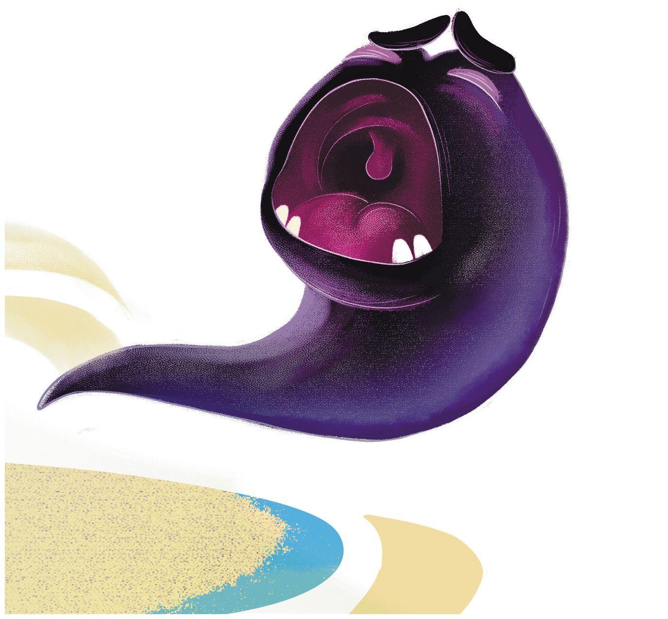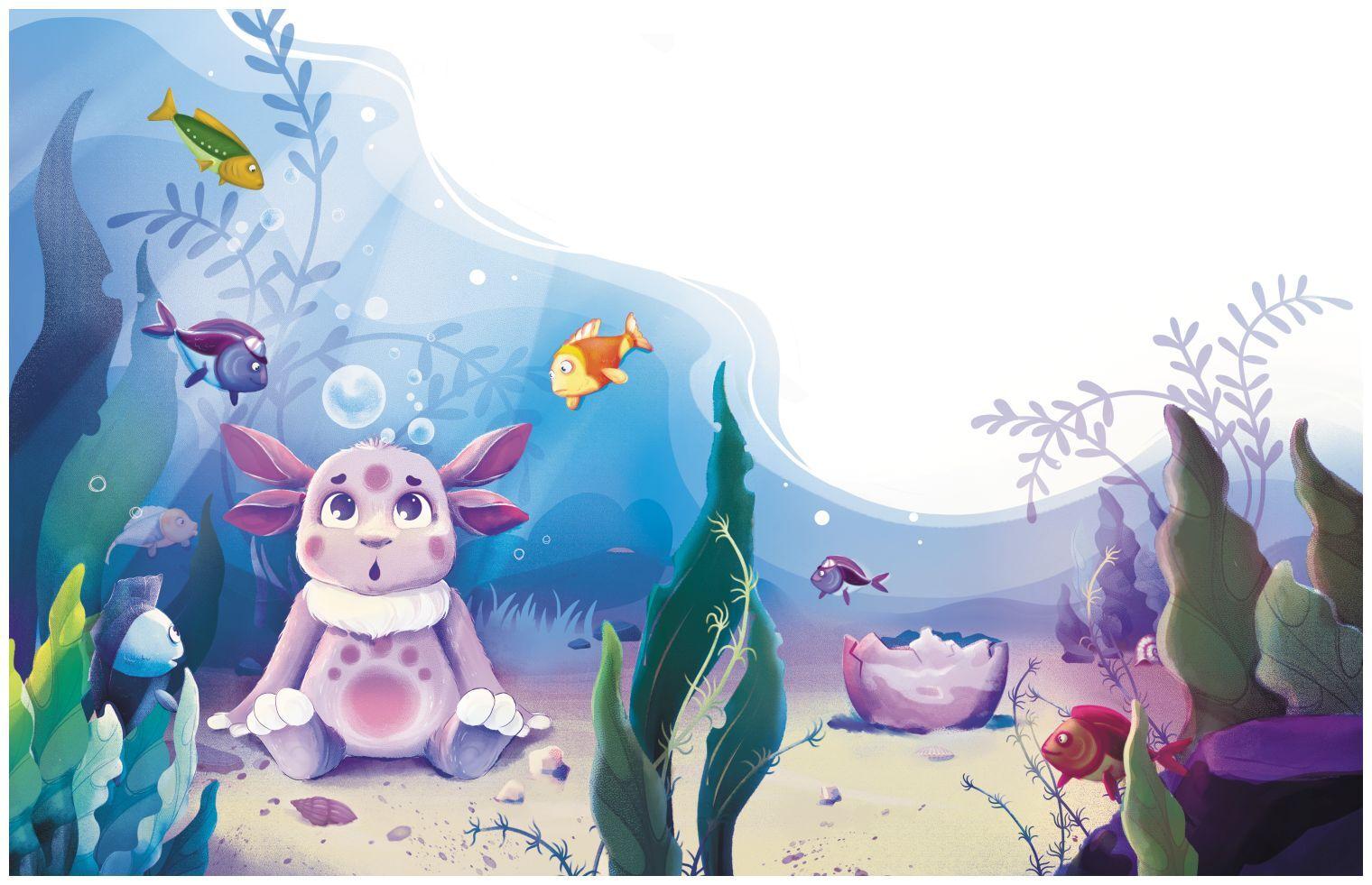 Половинка скорлупы опустилась на дно пруда. Вокруг неё собрались любопытные рыбки. Как вдруг из скорлупки показался фиолетовый зверёк.