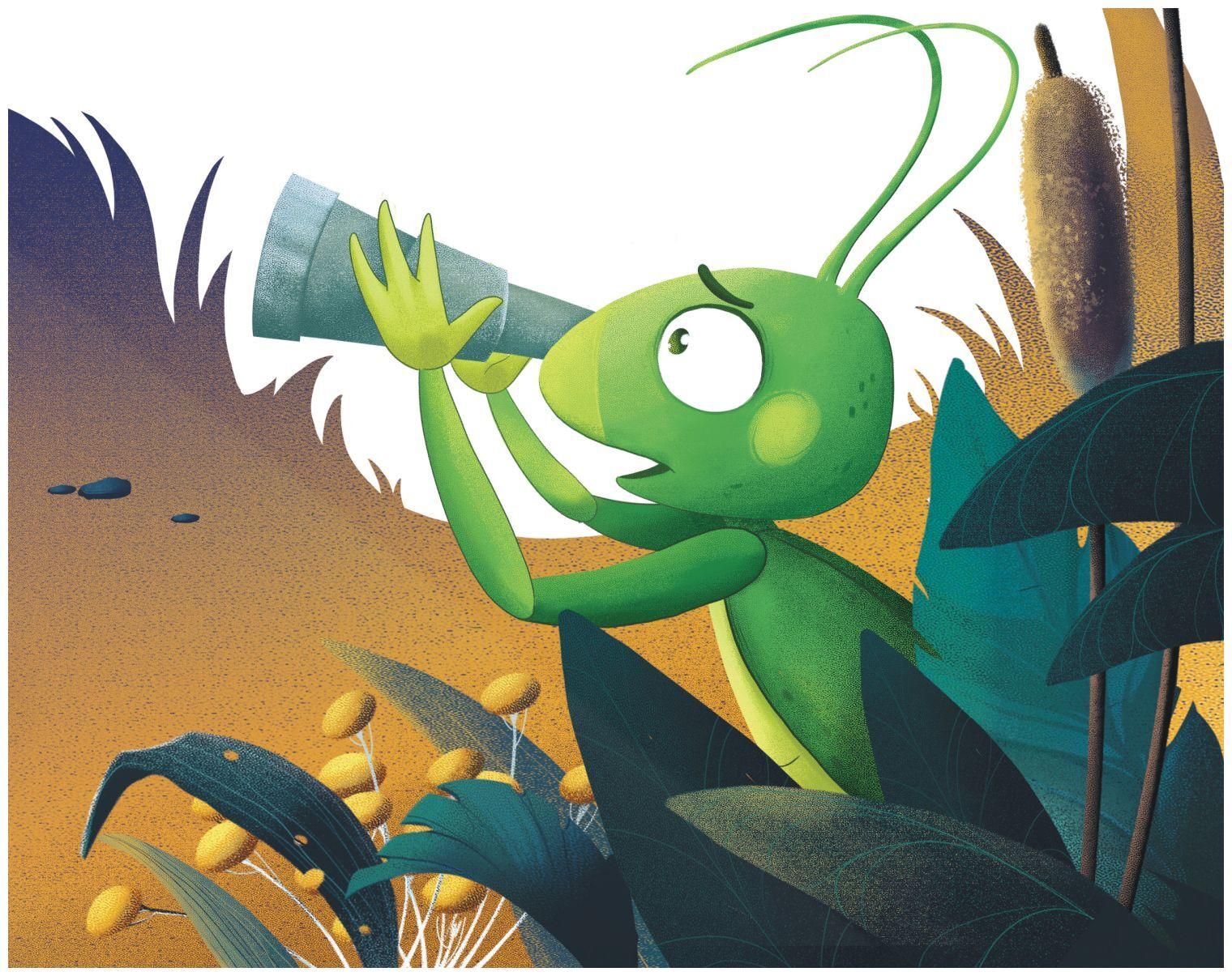 А кузнечик притаился на травинке и наблюдал за необычным зверьком. Наконец, он выглянул и спросил: