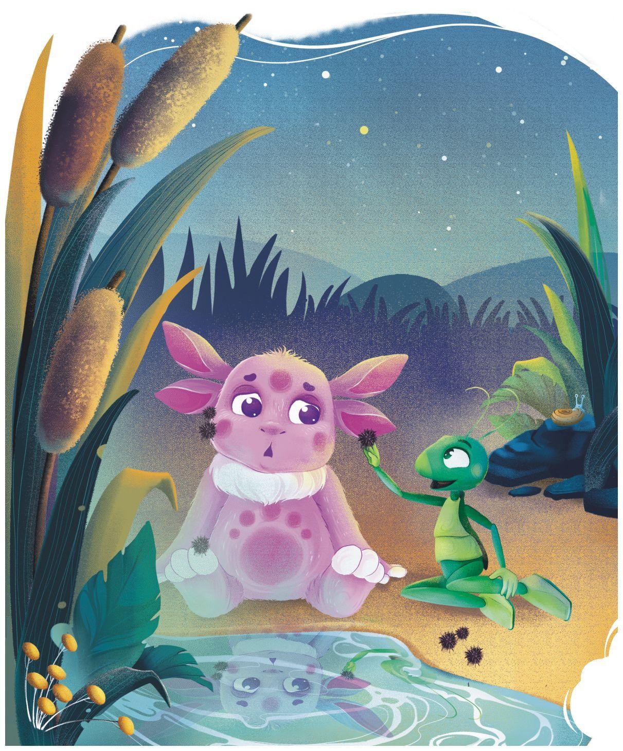Он наклонился и впервые увидел в воде своё отражение. Так лунный гость и просидел всю ночь на пруду. Он смотрел на луну, которая казалась такой близкой и такой далёкой одновременно. Малыш гадал, кто же он такой и почему оказался здесь.