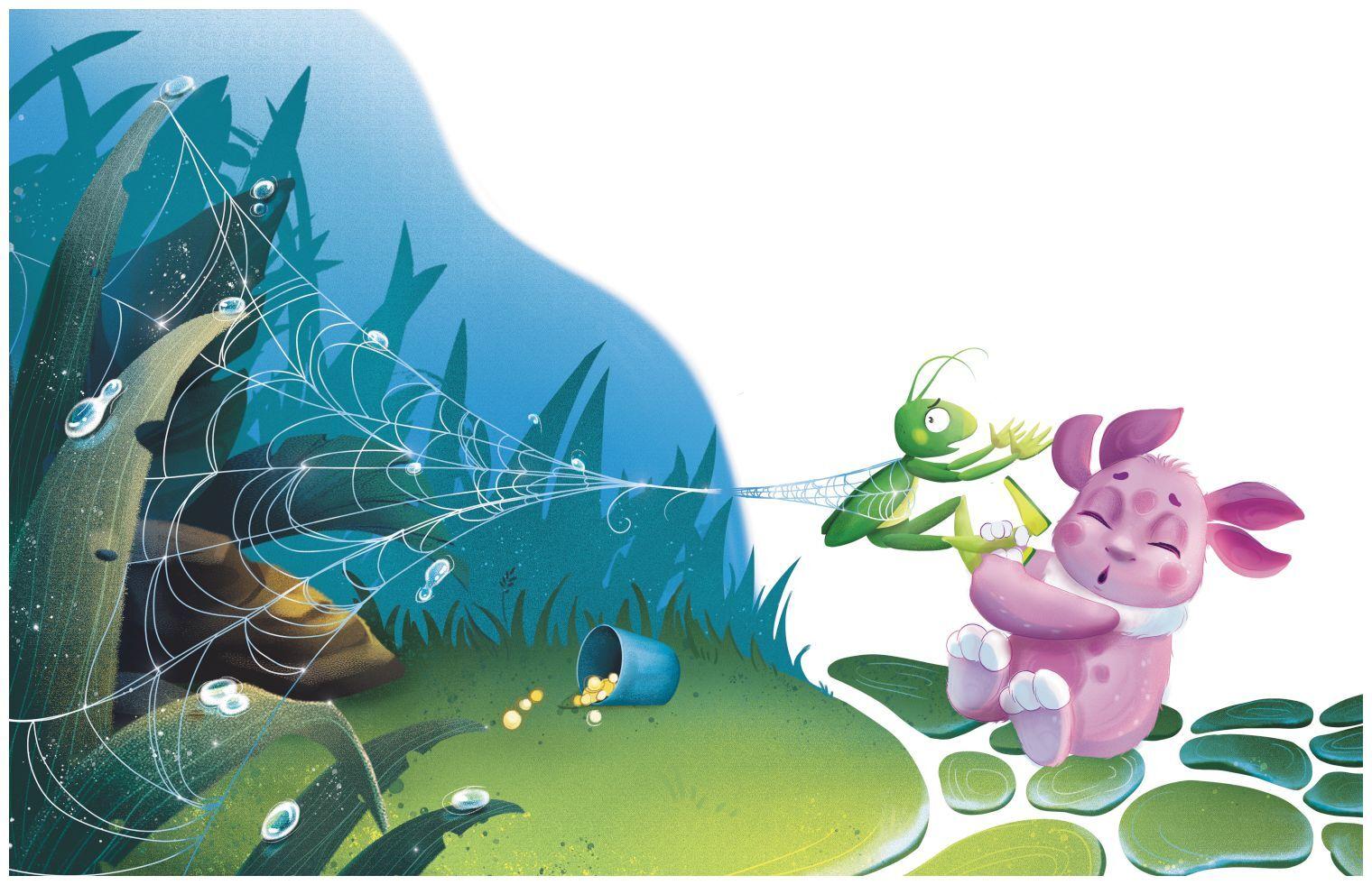 Лунтик поспешил выручить друга и стал тащить его на себя. Но липкая сетка никак не хотела отпускать кузнечика.