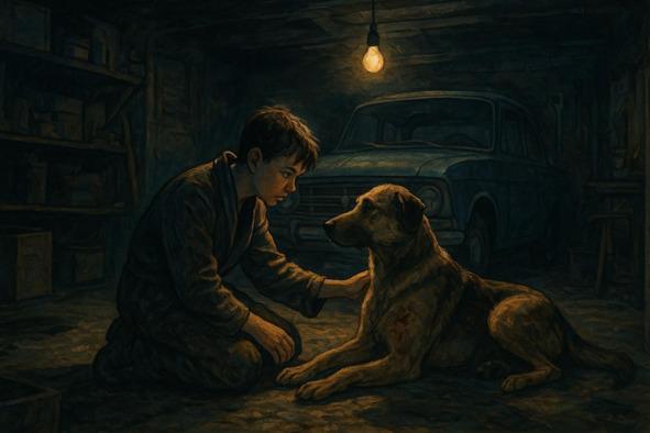 Коля осторожно подложил под бок тряпку. Они сидели друг напротив друга — мальчик в замасленном халате и пес с благородной мордой и перевязанным боком. Один — с трепетом первооткрывателя, другой — с достоинством попавшего в беду джентльмена.