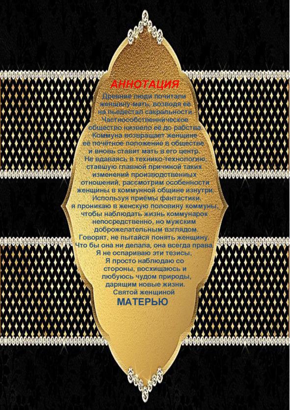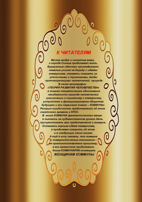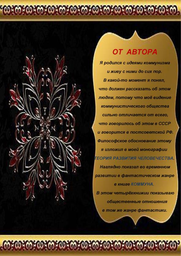 В монографии «Теория развития человечества» я показал устройство и функционирование общества будущего и его первичной ячейки — коммуны. В книге «Коммуна» фантастического жанра я показал мои представления о коммуне. Продолжаю говорить об этом и в следующих своих книгах. А ещё я хочу сказать, что коммуна — не противопоставление прошлому, а его органичное продолжение.