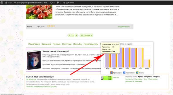 Это обычная посещаемость (дата на скриншоте 26 мая 2025 года), а во время праздников посещаемость еще возрастала до 3000 человек в день. И это при том, что стоит очень старый движок ВордПресс (с 2013 года), он не обновляется, салаты выкладываются 1 раз в месяц, а то и меньше, правила создания сео-статей там не наблюдаются и присутствует процент неуникального контента (примерно 40%). Но вот он результат индексации, пусть сайт не в ТОПе поисковой выдачи на такое ключевое слово как «рецепт салата», но он нашел свою целевую аудиторию.