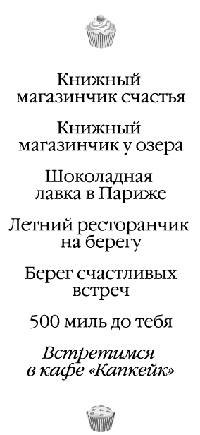 Оригинальное кондитерское изделие, в основе которого лежат юмор, романтика и надежда. «Встретимся в кафе „Капкейк“» доказывает, что жизнь может быть не такой, как вы ожидаете, но в ней всегда есть место для десерта!