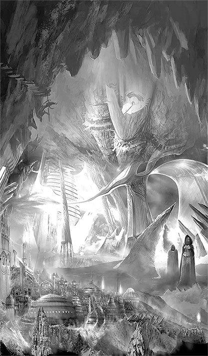 Позже я выскальзываю из зала на огороженный нависшей глыбой балкон, с которого виден океан. Город ярко сияет, освещаемый Домами Света, но за пределами их воздействия волны накатывают на берег в глубокой темноте. Впрочем, вдалеке подрагивают крошечные, бесплотные огоньки. Это корабли, плывущие к Мал Эйсте, Джарью или Векту. Море беспокойное, волнуемое глубоководными течениями и изменчивым ветром. Дыхание земли закачивается в каменные лёгкие с помощью гигантской системы, обеспечивающей конвекцию и давление. Хотя, как именно она работает, представляю себе очень смутно. Высоко наверху потолок гигантской пещеры озаряют созвездия фосфоресцирующих лишайников и водорослей.