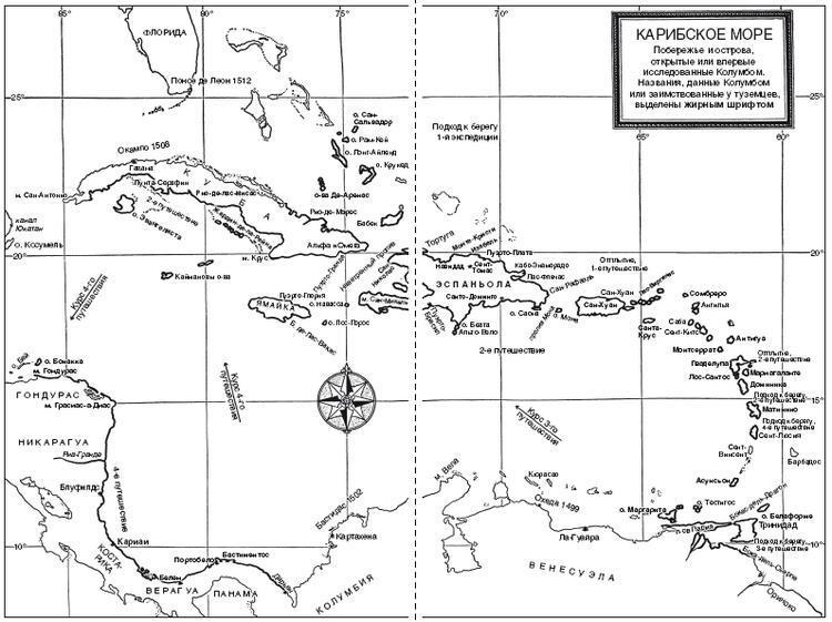 Возможно, найдутся читатели, которые окажутся разочарованными, не найдя здесь «подлинного портрета» Колумба – даже не ищите, его просто нет. Некоторые могут задаться вопросом, почему в этой книге нет общей карты, отображающей все четыре экспедиции туда и обратно, хотя другие, менее амбициозные биографии Адмирала обычно ее содержат. Истинная причина, опять же, заключается в том, что не существует достоверных материалов, отслеживающих внешние переходы Колумба через океан (за исключением Первого путешествия и, с очень большими допущениями, Третьего). Объясняется это тем, что только Первое было тщательно изучено опытными навигаторами. В остальных случаях океанских переходов мы знаем лишь только точки отправления и место выхода на сушу. Любая попытка проследить фактический курс, учитывая, что суда двигались под парусом, относится к области предположений и чистых догадок. Но наш опыт плавания в Карибском море позволил с достаточной точностью проследить маршруты Колумба вдоль американского побережья и между островами, отметить его якорные стоянки и определить пункты, которые он сам называл.