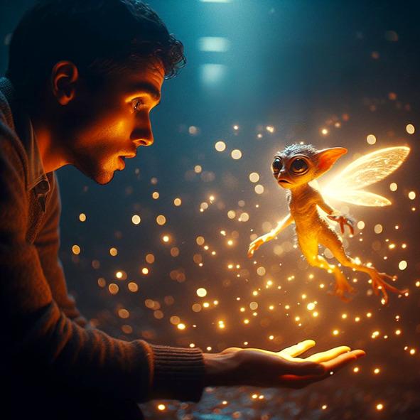 Это было свечение, исходящее от странного существа, похожего на маленькую фею. Она медленно парила в воздухе и излучала свет интересной янтарной окраски. Я был ошеломлен светом, который она излучала. Он был таким ярким и чистым, что казалось, что можно просто протянуть руку и дотронуться до него.