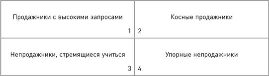Есть четыре основных типа продажников: продажники с серьезными запросами, стремящиеся развивать и оттачивать свои умения; продажники загнанные, зашоренные, циничные и косные; непродажники, понявшие, что им нужно уметь продавать — врачи, владельцы автомастерских, чистильщики ковров и пр.; непродажники, еще не понявшие этого или сопротивляющиеся этой мысли.