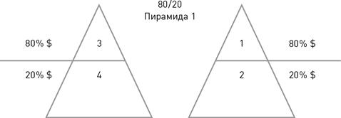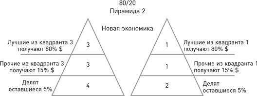 В Новой экономике 95% денег стекаются в первый и третий квадрант, где делятся и распределяются непропорционально самыми целеустремленными продажниками и самыми заинтересованными непродажниками. Сегодня обязательно быть умнее, проницательнее, прогрессивнее, агрессивнее, организованнее, и во всех отношениях «-ее» других, чтобы выбраться на вершину пирамиды, которая выглядит вот так.