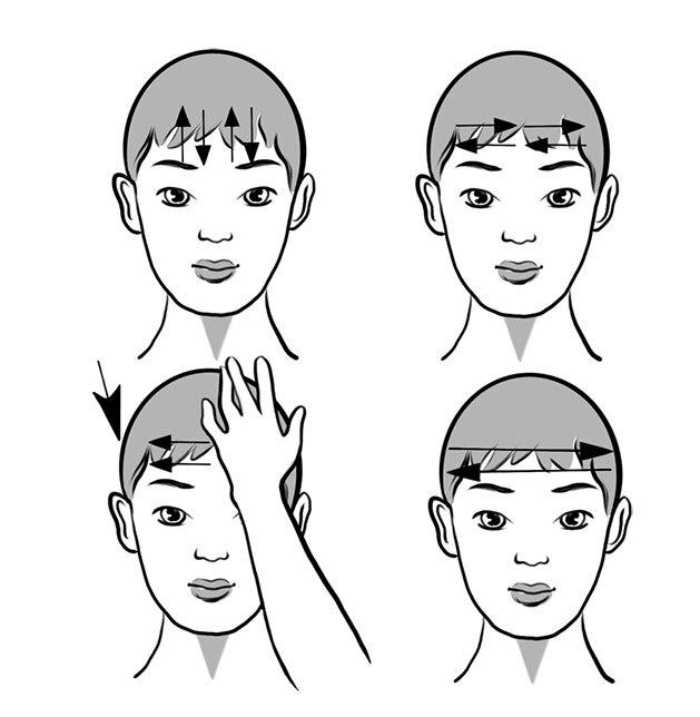 – «Пилка» (расслабляем лобную мышцу, затем проглаживаем лоб и пальцами массируем голову от лица к затылку);