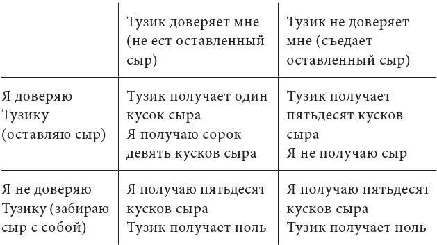 Конечно, эти стратегии не так просты, как «всегда доверяй» или «всегда обманывай». Ведь если вы всегда доверяете, другому выгоднее всегда вас обманывать. Если вы будете из раза в раз оставлять сыр наедине с Тузиком и уходить из комнаты, ушлый пес из раза в раз будет его съедать. Ничего личного, просто самая выигрышная стратегия.