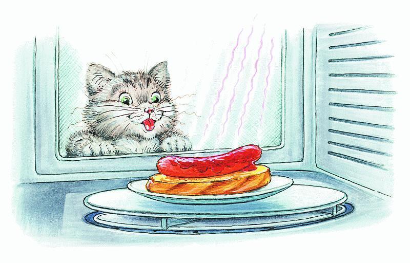 Мама кладёт в печь ломтики хлеба с сосисками, разрезанными вдоль и политыми кетчупом, закрывает дверцу микроволновки, нажимает кнопки на панели. Печь начинает негромко гудеть, внутри неё загорается свет. Теперь видно, как бутерброды вращаются на плоской тарелке. Не успеешь оглянуться, и горячие, подрумяненные бутерброды уже готовы…