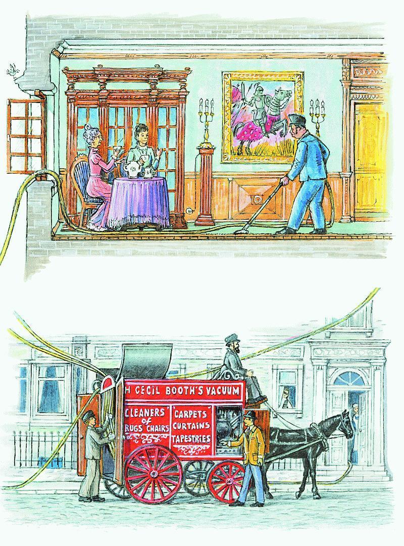 Так было в начале XX века в Лондоне, пылесос и вправду представлял собой фургон на «лошадиной тяге». Он разъезжал по улицам, останавливаясь возле домов, хозяева которых «вызывали» пылесос. В окно протягивался резиновый шланг длиной в 30 метров, и работники, обслуживающие пылесос-фургон, принимались за уборку. Грохот от такой уборки стоял на всю округу, однако разъездной пылесос пользовался огромным спросом и даже вошёл в моду. Дамы высшего лондонского света взяли в обычай пить чай, наблюдая, как по коврам и полам их домов ползает огромный шланг, наводя чистоту.