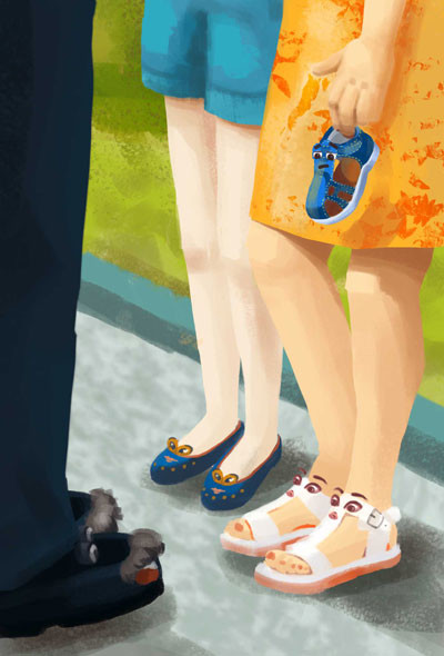 — Так вот, — продолжали туфельки, — Ботинки перешли на другую сторону улицы, а там лужа… А мы по лужам не ходим — запачкаемся. Попроси кого-нибудь другого, малыш, или сам перейди улицу — пропели туфельки и ритмично зацокали каблучками.