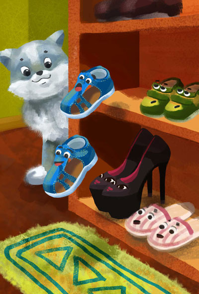 Но сандалики не успели помочь кроссовочкам, потому что на шум, который получился, когда Крис и Крос прыгали, прибежала мама Арти. Она увидела, что кроссовочки и сандалики не на своих полках, а на полу, причем кроссовки еще и перевернуты. Тут она увидела Кесю и решила, что это его лап дело.