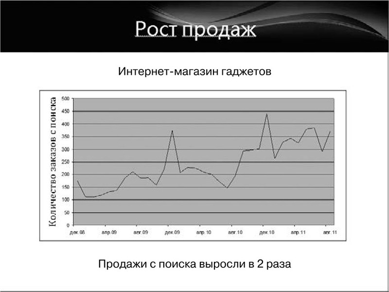 Пример 6. Интернет-магазин гаджетов с узким ассортиментом продукции (300–400 наименований специфических товаров – наушники, кабели, чехлы и пр.). На рис. 1.6 приведен график, отображающий результаты за два года работы: в этот период продажи увеличились в два раза. Это не предел: денег интернет-магазин мог бы заработать и больше, если бы расширил ассортимент. Чем интереснее предложение, тем выше продажи.