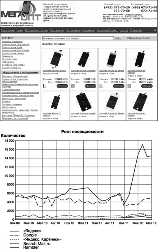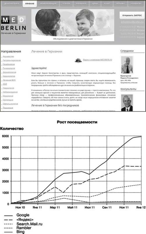 Пример 4. Сайт компании, занимающейся организацией лечения в Германии. Мы взяли его, что называется, с нуля. На рис. 1.4 вы видите, как в течение года планомерно росла посещаемость веб-страниц из разных поисковых систем: на сайт приходят представители целевой аудитории, заинтересованные в предлагаемых компанией услугах. В начале их работы звонков и обращений с сайта не было вообще. Сегодня они получают около двух десятков обращений в день, что для сайта подобной тематики хороший результат.