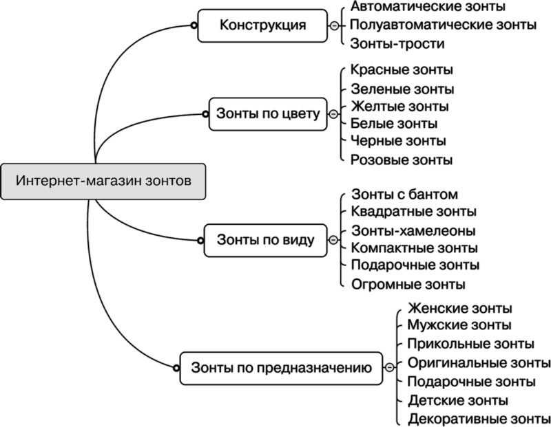 • Построение структуры сайта. Если у вас собрано маленькое ядро запросов, получается такая же убогая структура (рис. 1.9). Как следствие – низкие позиции, небольшой трафик и недовольные клиенты. Хороший сайт всегда имеет логичную развернутую структуру (рис. 1.10).